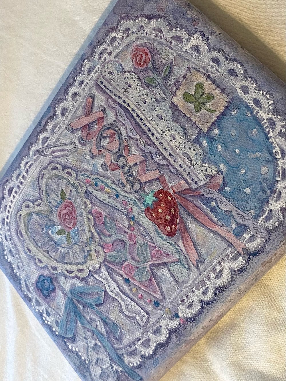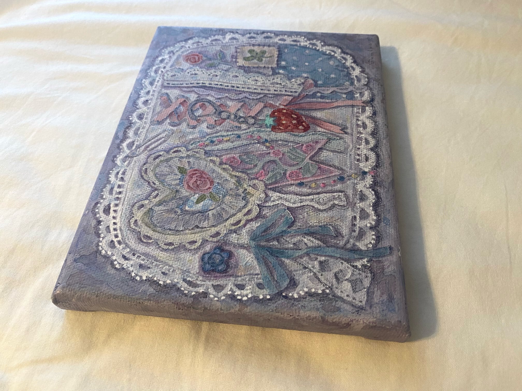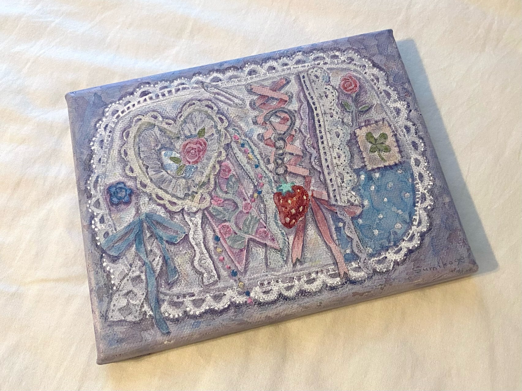 ・パネル作品なので、ピンなどに引っ掛けて、そのまま飾ることができます。