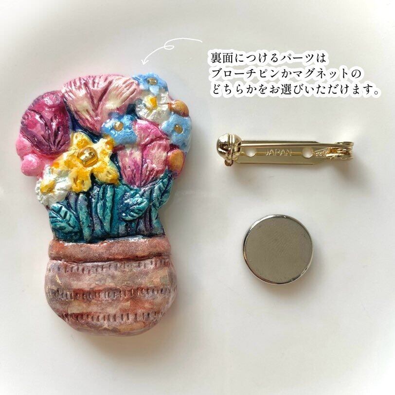 裏面のパーツを、ブローチピンにするか、マグネットにするか、お好きな方をお選びいただけます。